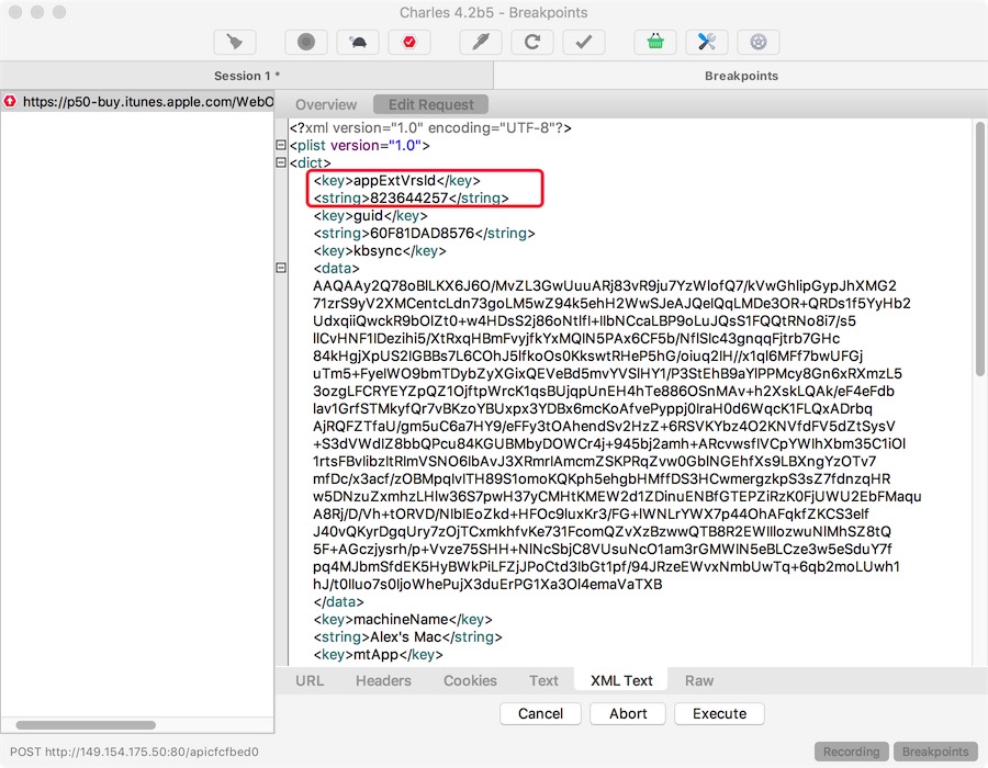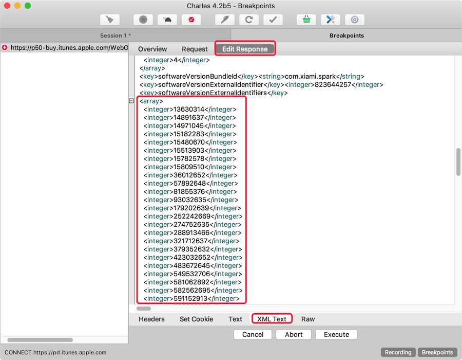 重新搜索虾米音乐,并点击下载按钮,这时 Charles 会弹出窗口,然后在弹出窗口的右下三个按钮中选择 'Execute' ,这一步是我们请求服务器,紧接着出现的就是服务器给我们的响应,然后选择 'Edit Response' - 'XML Text' ,然后向下滚动找到下图中的部分,这里是所有虾米音乐的版本的序列数字,但是这里没有办法直接看到版本号,越大的数字版本号越新。这里可以通过在手机 App store 中查看软件的版本记录,找到大概要回退多少个版本,然后数字从大到小找个半个序列数字记录下来,然后在下面三个按钮中选择 'Abort' ,这时 iTunes 会弹出一个报错窗口,关掉即可。