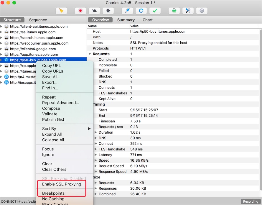 点击下载后,在 Charles 会出现监听到信息,找到一条 'p[xx]-buy.itunes.apple.com' ,其中 xx 是一个随机的数字,选中它,然后右键菜单栏中勾选 'Enable SSL Proxying' 和 'Breakpoints' 。设置完成后,在 iTunes 下载中,清理下载记录。