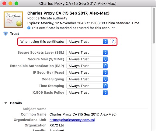 选中导入的证书,然后右键选择 'Get Info' ,设置证书信任状态