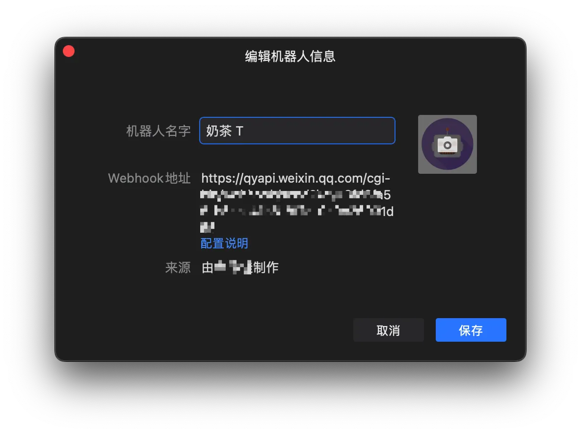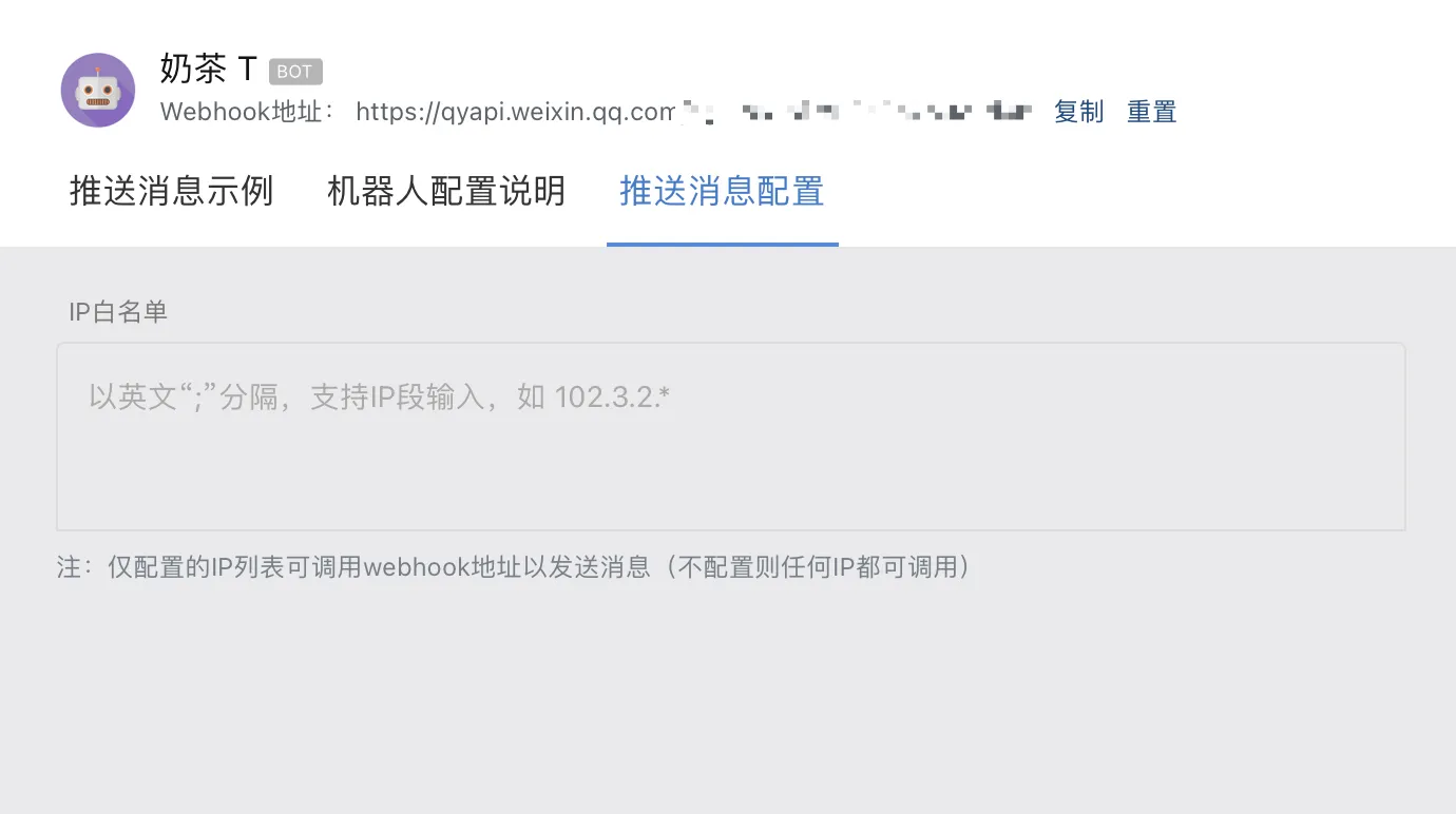 成功创建机器人后,会获取到一个 用于推送消息的 webhook Key
