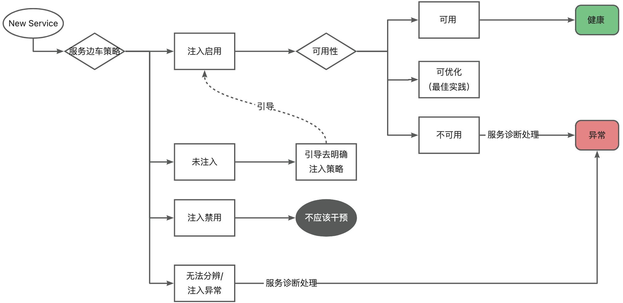 - 第一层,先从边车注入策略上细分,明确注入禁用的,不应该标记状态为异常;因为用户不需要网格来管理,这部分应该独立出来。